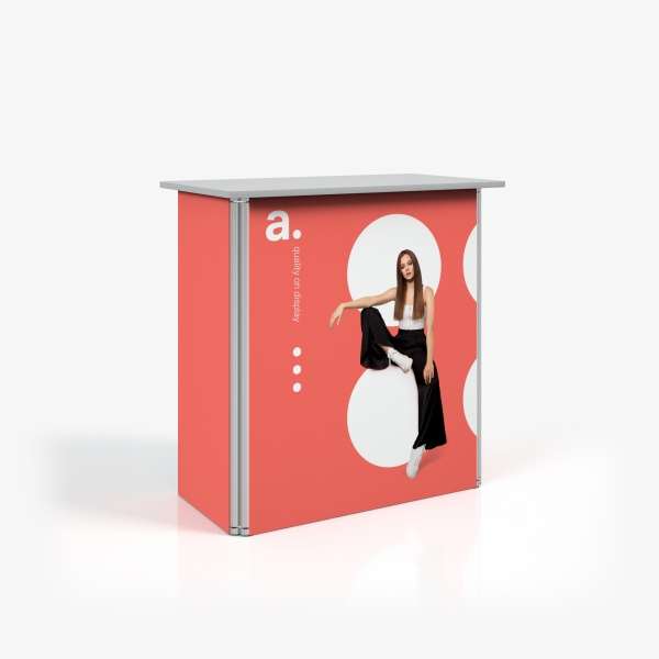 Il bancone pieghevole per fiere adTribune Seg è un supporto pubblicitario e un comodo posto di lavoro in uno. Puoi utilizzarlo durante fiere, conferenze, presentazioni di prodotti e altri eventi di marketing. adTribune Seg si distingue per la sua leggera costruzione pieghevole realizzata in profili di alluminio. Al bancone pieghevole per fiere, includiamo stampe sulle quali applicheremo le tue grafiche personalizzate.