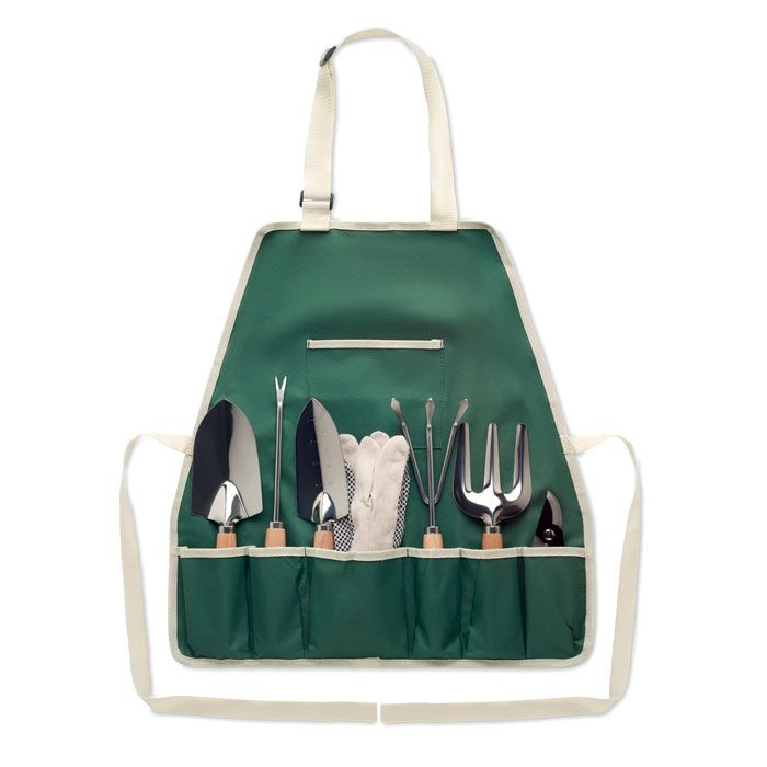 Set di 7 attrezzi da giardino presentati in grembiule. 1 paio di guanti da giardino, 2 forchette, 1 forbice, 1 sarchiatrice e 2 palette.