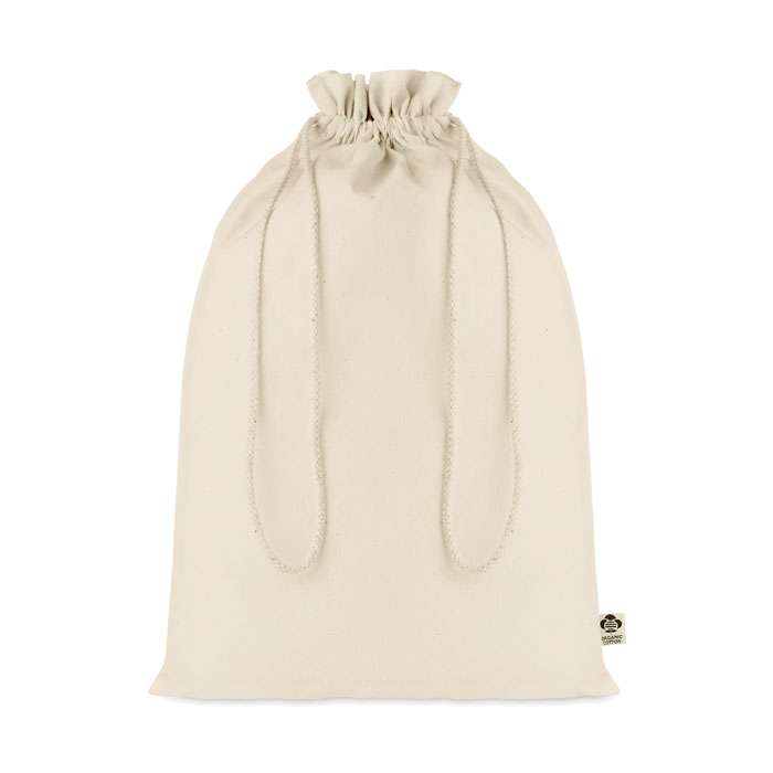 Sacca grande da regalo con cordoncino in cotone biologico. Dimensioni ca. 30 x 47 cm. 105 gr/m².