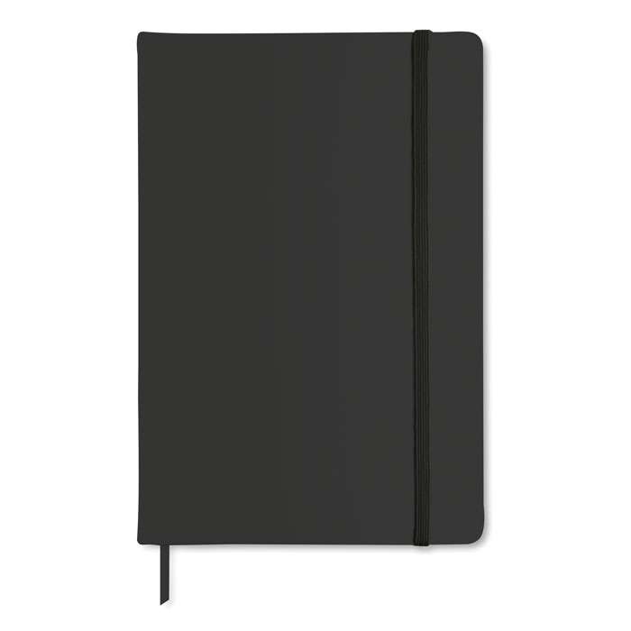 Notebook A5 con copertina rigida in PU. 192 pagine in carta riciclata (96 fogli). Chiusura con elastico e segnapagina abbinati.