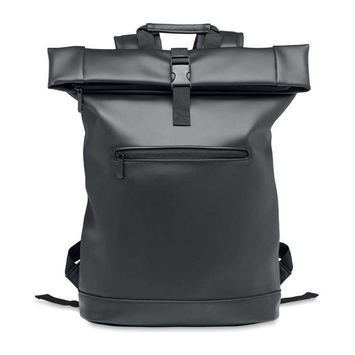 Zaino arrotolabile per laptop da 15 pollici in morbido PU con schienale imbottito e base rinforzata. Ampia tasca frontale con cerniera. La fodera è in RPET 210D.