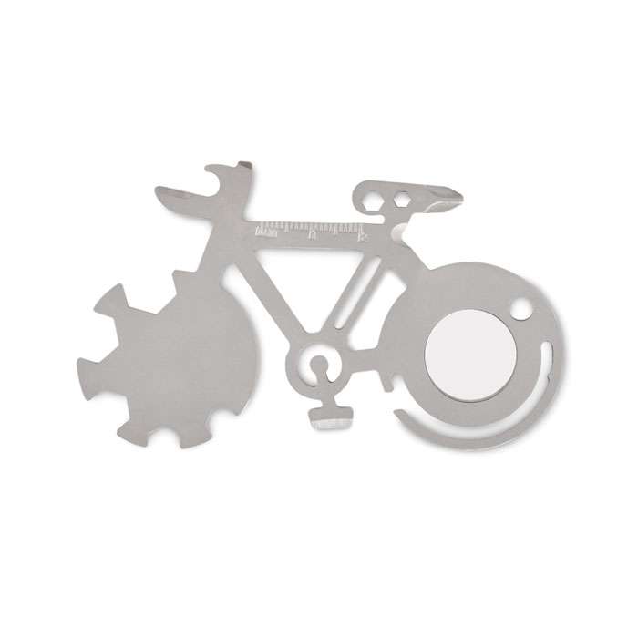 Multi-tool 11 in 1 in acciaio inox a forma di bicicletta. Funzioni: apribottiglie, coltello, righello o cacciavite a croce.