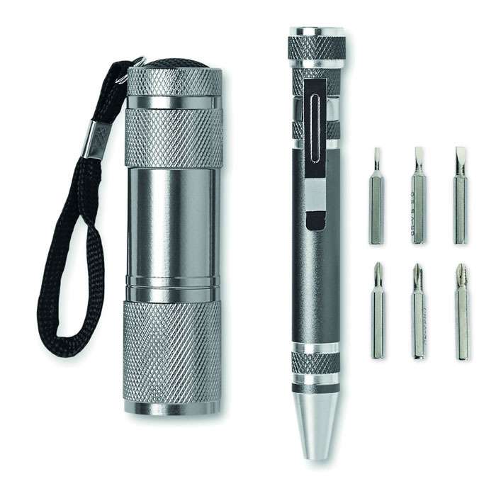 Set attrezzi 2 pezzi. Torcia in alluminio con 9 luci al LED e penna multiuso. Include 3 teste sfuse e 3 teste Philips. 3 batterie ministilo NON incluse. Fornito in scatola nera.