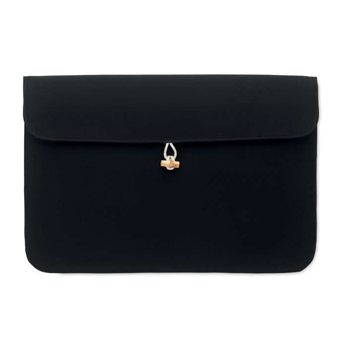 Custodia imbottita per laptop da 15 pollici in cotone da 220 gr/m². Fodera interna 120 gr/m². Chiusura con bottoni in bamboo.