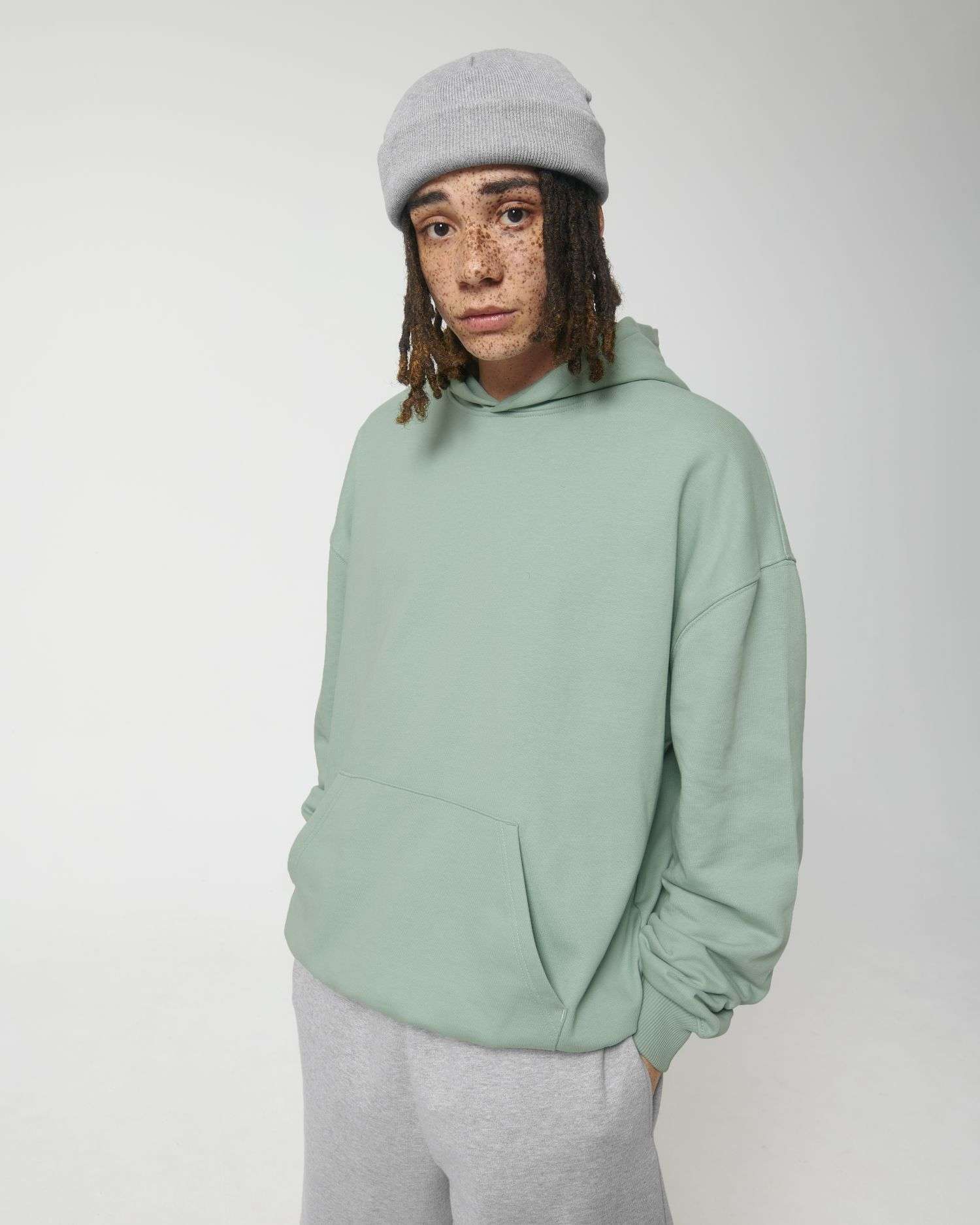 Manica a giroCappuccio a doppio strato nel tessuto principaleFettuccia in jersey all’interno del colloMezzaluna all'interno del collo nel tessuto principaleImpuntura singola sullo scollo e intorno al cappuccioFondo manica e bordo inferiore a costine 2x1Doppia impuntura su giromanica, polsino e bordo inferioreTasca a marsupio sul davanti
