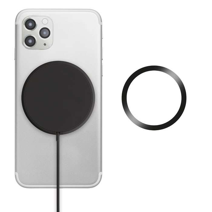 Caricabatterie wireless magnetico in ABS. Uscita: DC 9V/1.1A (10W). Compatibile con iPhone® 12 e successivi. Compreso anello metallico magnetico per supportare la ricarica di altri telefoni ricaricabili wireless non magnetici.
