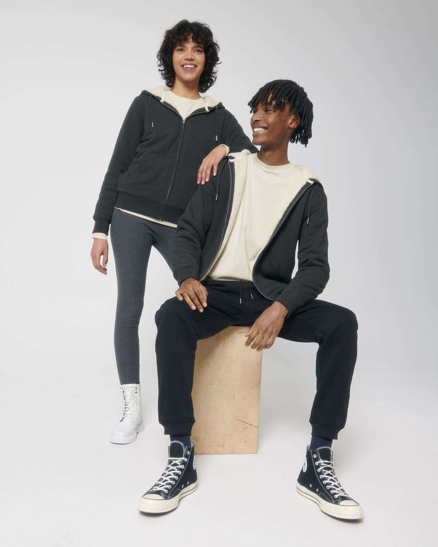 Maniche a giroCappuccio foderato in Sherpa riciclatoCordoncini rotondi tono su tono con estremità in metalloOcchielli in metalloFettuccia spigata all’interno del collo in colore neutroMezzaluna all’interno del collo nel tessuto principaleZip coperta in metallo davanti al centroFondo manica e bordo inferiore a costine 1x1Doppia impuntura su giromanica, fondo manica e bordo inferioreTasca a marsupio sul davantiCompletamente foderato in Sherpa riciclatoTaschino interno sul pettoZip interna invisibile sul fondo per una facile personalizzazione