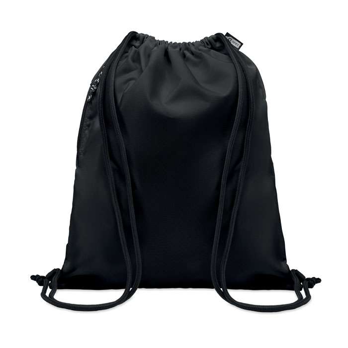 Sacca in poliestere 300D RPET con tasca esterna laterale con cerniera. Cordini spessi.
