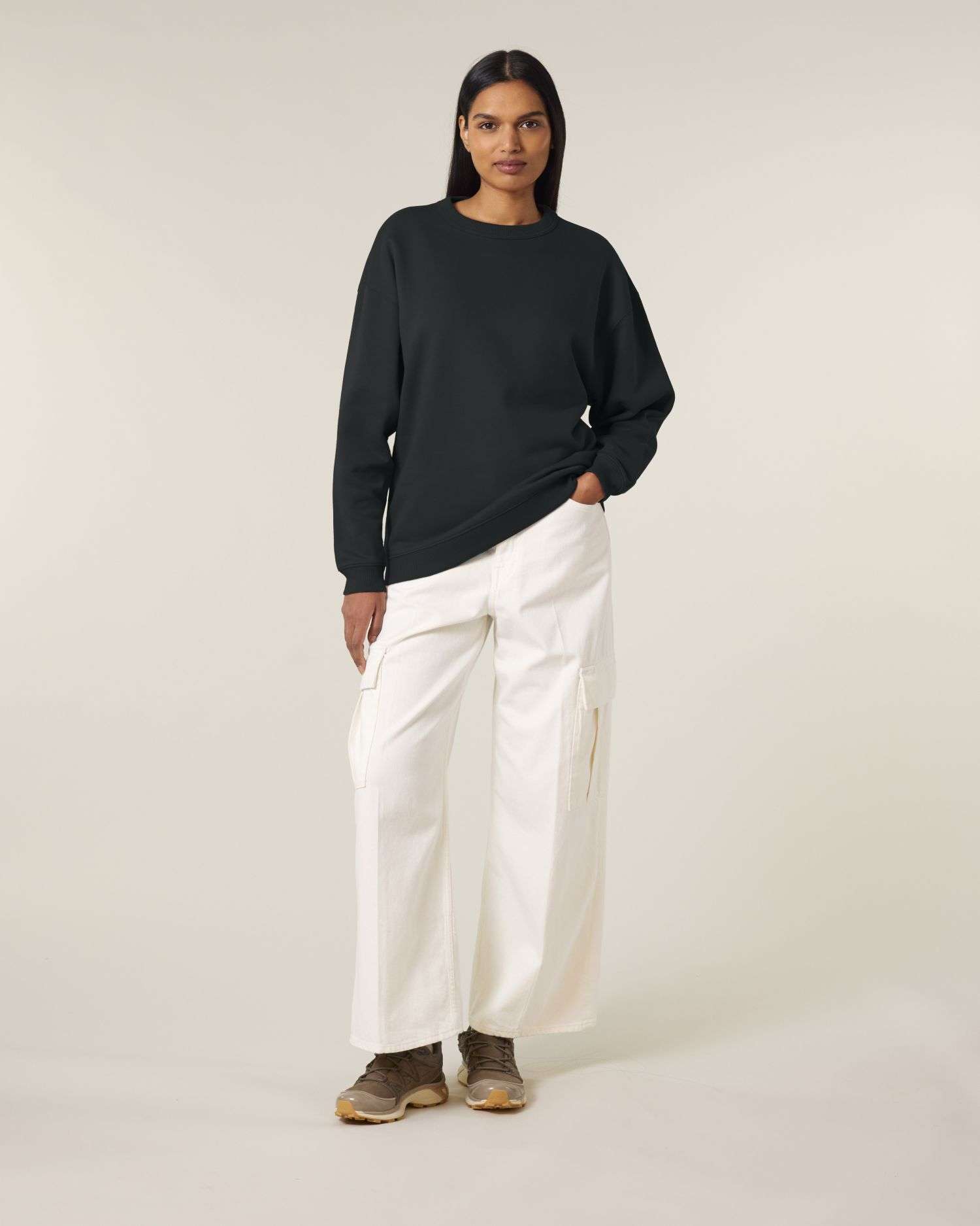 Maniche montateSpalle sceseCostine 1x1 su colletto, orli delle maniche e orlo inferioreCuciture con doppio ago su tutte le cucitureNastro gros grain interno al colloMezzaluna interna in tessuto