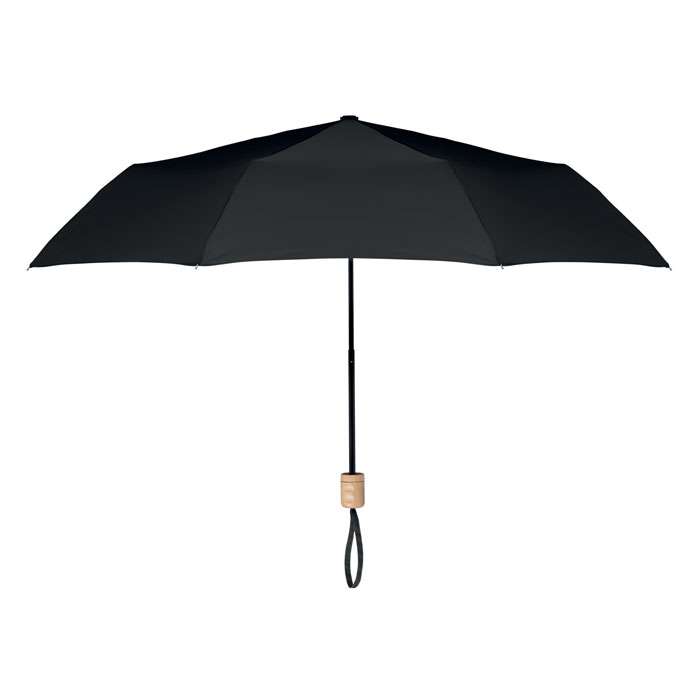 Ombrello 21'' pieghevole, 3 sezioni con tessuto pongee RPET da 190T. Struttura placcata nera e nervature con manico in legno. Apertura e chiusura manuale. Sacca nello stessomateriale.