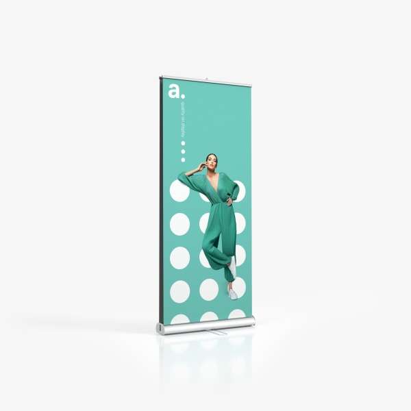 Il banner autoportante è sostenuto da una base ampia. La cassetta in alluminio è resistente e stabile. Questo rende il roll-up bifacciale efficace anche in condizioni dinamiche di fiere, dove molti potenziali clienti si muovono e si radunano intorno al tuo stand.