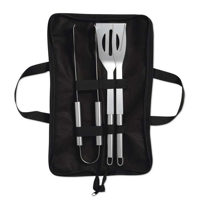 Set di tre accessori in acciaio: spatola, pinza e forchettone. Confezione in TNT nera con chiusura zip.