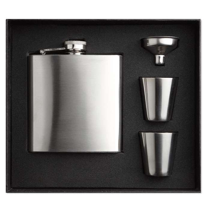 Set composto da: fiaschetta da 175 ml, due bicchierini, imbuto. In confezione regalo nera.