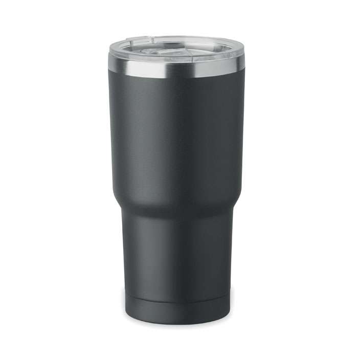 Bicchiere in acciaio inox riciclato a doppio strato (90% acciaio inox riciclato e 10% acciaio inox). Coperchio con foro scorrevole per bere. Anti-goccia. Capacità 550 ml.