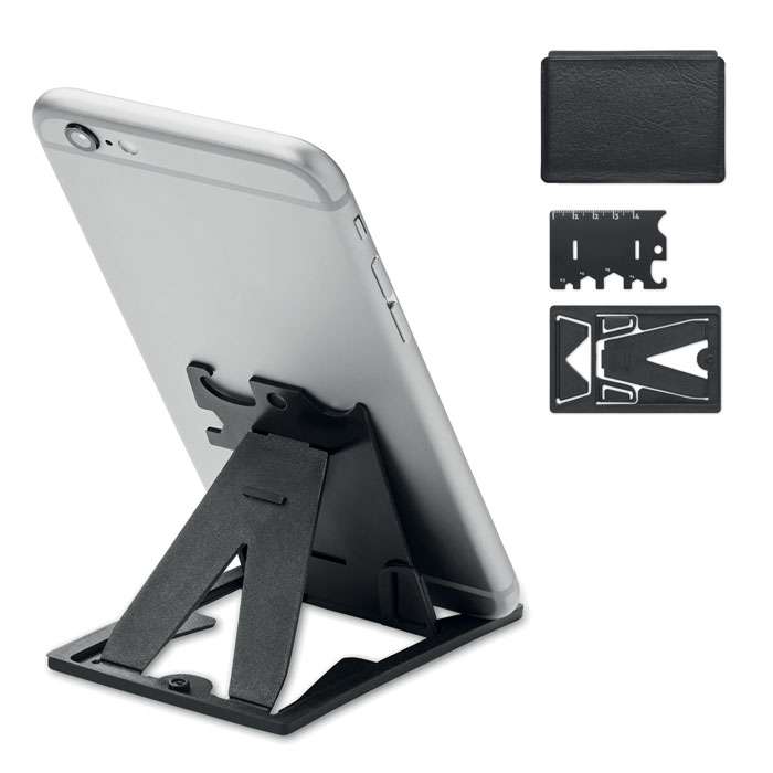 Multiutensile in acciaio inox e PP con funzionalità di supporto per il telefono con 6 funzioni in custodia in PU. Include cacciaviti, righello, chiave esagonale e apribottiglie.
