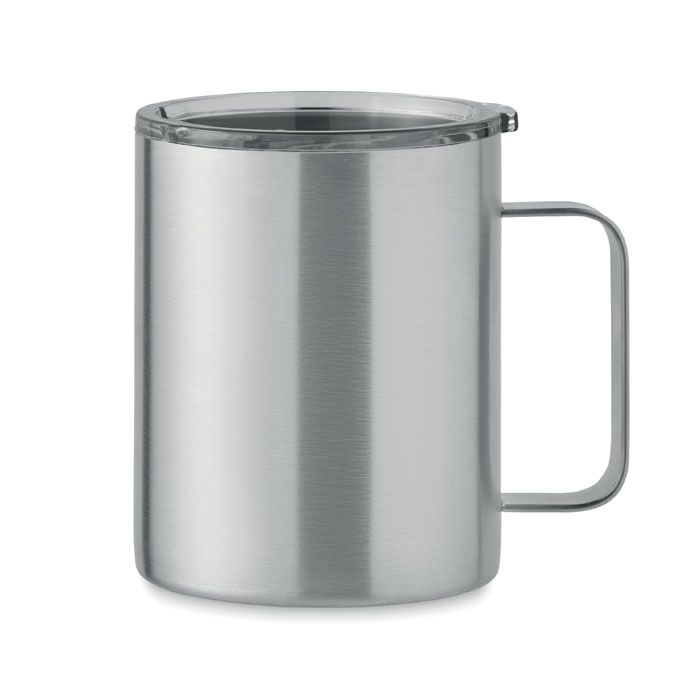 Bicchiere a doppio strato in acciaio inox riciclato (90% acciaio inox riciclato e 10% acciaio inox) con coperchio con cannuccia interna, imboccatura pieghevole e apertura per bere direttamente. Capacità 850 ml. Senza perdite.