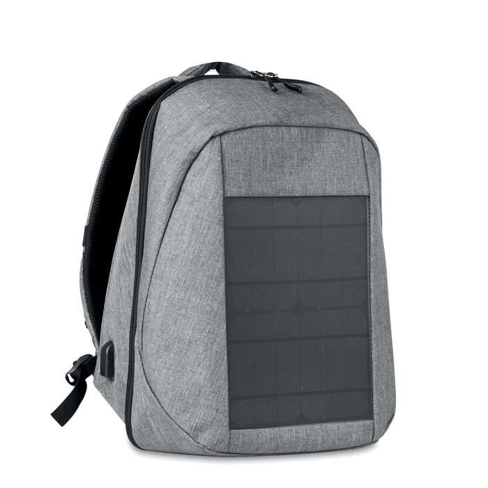 Zaino in poliestere 600D bicolore con caricatore incorporato per pannello solare con porta USB e cavo. Il tempo di ricarica è di circa 5-6 ore al sole diretto. 2 scomparti principali. Diverse tasche interne. Include uno scomparto per laptop da 13 '', spallacci imbottiti, tasca aggiuntiva per tablet.